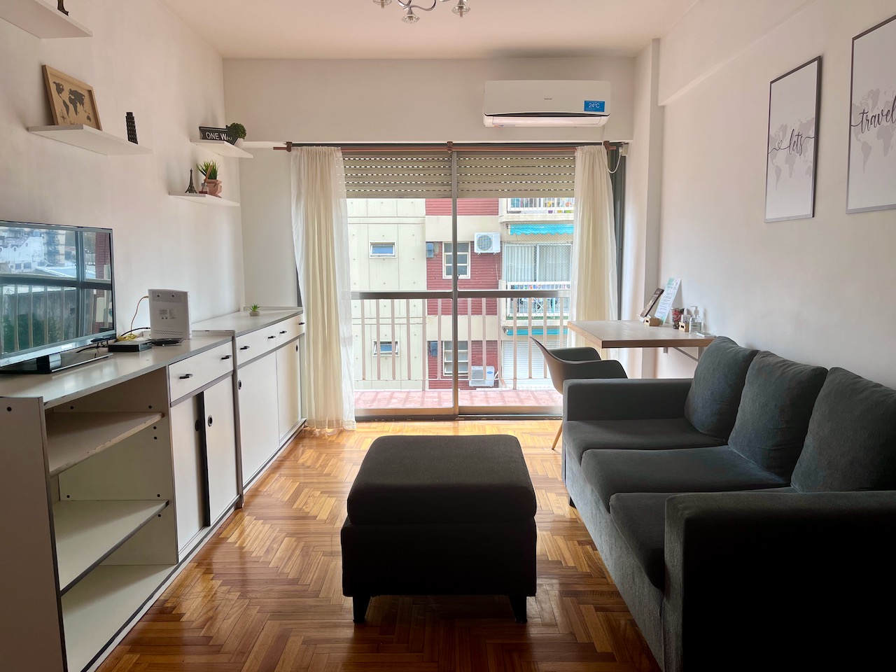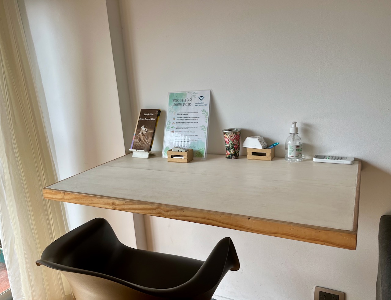 Si te gusta viajar mientras trabajas, ¡este espacio sería genial para ti! ¡En la sala de estar instalamos un área de trabajo con un escritorio plegable y mucha luz natural!
