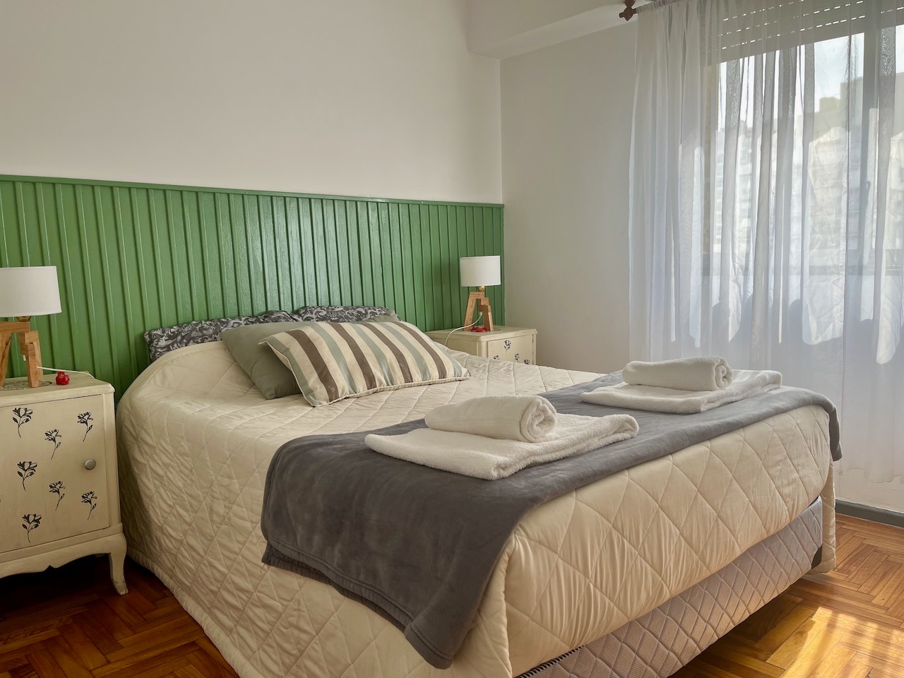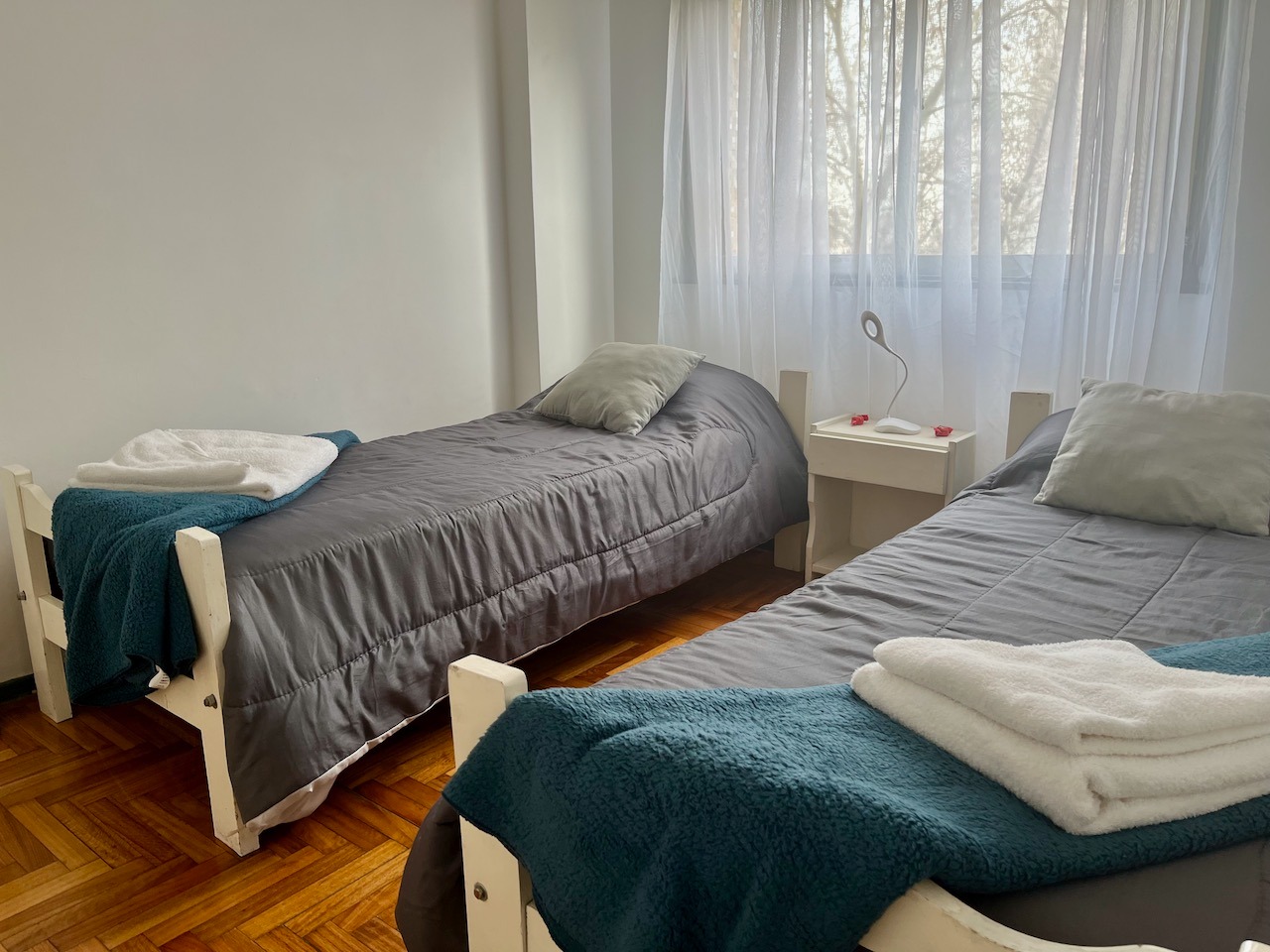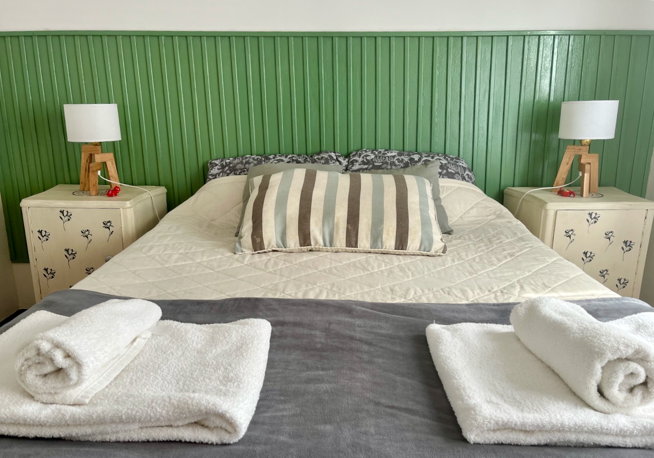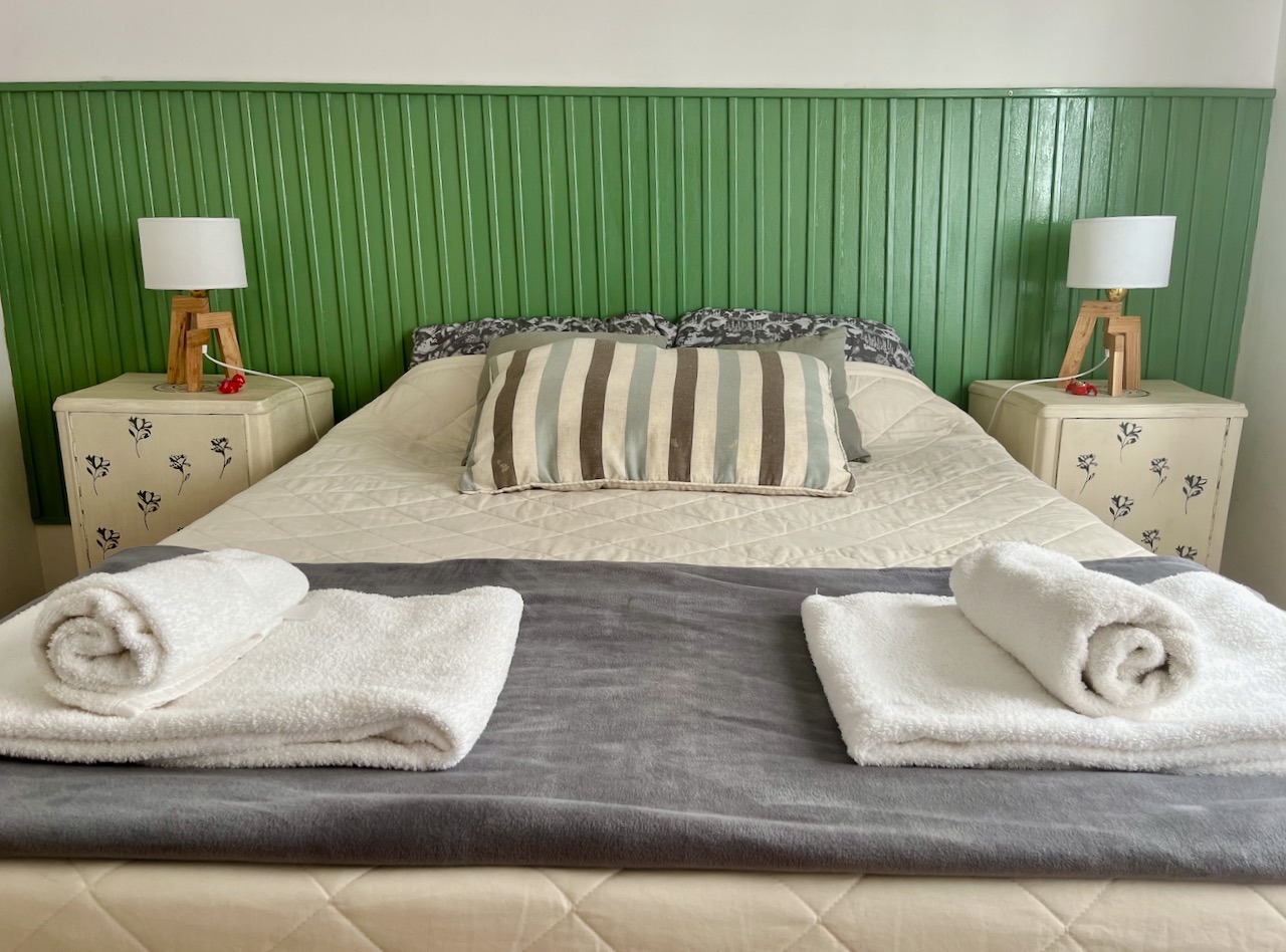 Equipado para 4 personas: tiene 2 habitaciones: una con una cama doble y otra más pequeña con dos camas individuales. Un baño completo y una cocina con platos, utensilios y Electros.